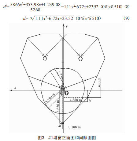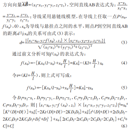 (1)本文通過空間三維算法提出鐵塔瓶口電氣間隙和導(dǎo)線與懸掛點(diǎn)之間水平距離的關(guān)系,可用一元二次方程表示,發(fā)現(xiàn)導(dǎo)線離開塔窗后電氣間隙先減小后增大,與塔身最小距離出現(xiàn)在導(dǎo)線離開塔窗后的一小段距離之內(nèi),求取鐵塔瓶口電氣間隙即為求取一元二次方程的最小值。