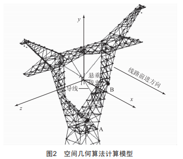 圖2所示為建立鐵塔、V型絕緣子串和導(dǎo)線的三維模型,通過模型分析可知,塔身與導(dǎo)線最近的點(diǎn)在下曲臂內(nèi)側(cè)主材上,求解鐵塔瓶口電氣間隙可轉(zhuǎn)換成求解導(dǎo)線與空間直線AB的最小距離。