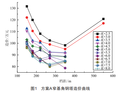 當(dāng)導(dǎo)線安全系數(shù)較小時(shí),導(dǎo)線弧垂較小,可以使用呼高較小的塔,但與此同時(shí),導(dǎo)線運(yùn)行張力較大,使得耐張塔增重明顯。當(dāng)導(dǎo)線安全系數(shù)較小時(shí),相同檔距下導(dǎo)線弧垂較大,為了滿足安全距離要求,需要使用呼高較大的塔,或減小使用檔距,這也是通常鋼管桿規(guī)劃安全系數(shù)大、檔距小的原因。使用較小的檔距,也意味著使用更多的桿塔,這無疑會(huì)增加工程造價(jià)。因此,需要對(duì)不同導(dǎo)線安全系數(shù)下的架線立塔方案進(jìn)行比選,本文對(duì)導(dǎo)線安全系數(shù)K=2.5~8(步長(zhǎng)=0.5)下的12種排塔方案進(jìn)行比較,以得到適用于窄基桿塔的最優(yōu)安全系數(shù)。