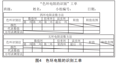 色環(huán)電阻讀取方法還可以用萬用表測量。使用萬用表的方法步驟和注意事項要規(guī)范,然后以小組為單位進(jìn)行技能比拼,完成工單,如圖4所示,用色環(huán)識別法和萬用表測量法兩種方法讀出色環(huán)電阻的阻值。