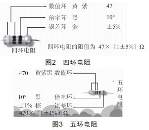 色碼法是根據(jù)色環(huán)電阻表面的顏色來識別電阻阻值。四環(huán)電阻阻值的識別方法:四環(huán)電阻前兩環(huán)代表的是數(shù)值環(huán),第三環(huán)代表的是倍率環(huán),最后一環(huán)代表的是誤差環(huán)。從四環(huán)電阻的識讀上升到五環(huán)電阻的識讀,符合建構(gòu)主義規(guī)律。這里主要講解的是四環(huán)電阻和五環(huán)電阻每一環(huán)代表含義的相同之處和不同之處,不同之處是四環(huán)電阻前兩環(huán)代表數(shù)值環(huán),而五環(huán)電阻前三環(huán)代表數(shù)值環(huán)。相同之處是,四環(huán)電阻、五環(huán)電阻倒數(shù)第二環(huán)和最后一環(huán)分別代表倍率環(huán)和誤差環(huán)。結(jié)合色碼法,圖2、圖3為四環(huán)電阻和五環(huán)電阻,四環(huán)電阻的阻值是47Ω,誤差土5%:五環(huán)電阻的阻值是470Ω,誤差士1%。色環(huán)電阻的識別方法同樣適用于色環(huán)電容的識讀。