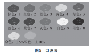 棕1紅2橙是3,4黃5綠6是藍(lán),7紫8灰9雪白,黑色是0記心間。金5銀10它是尾,數(shù)值倍率誤差環(huán),依次讀出是阻值??谠E朗朗上口,方便學(xué)生快速記憶,如圖5所示。