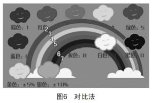 恰好生活中彩虹的顏色與色環(huán)電阻顏色代表的數(shù)值很相近,如圖6所示,這個方法也能使學(xué)生快速記憶色環(huán)電阻顏色代表的數(shù)值,經(jīng)過教學(xué)實踐,效果非常好,可以使學(xué)生在沒有色環(huán)電阻阻值表的情況下快速識別出色環(huán)電阻的阻值。