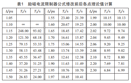 計算公式中不再包含限制器的啟動值。其中,Ⅰfmax為最大勵磁電流,對應參數(shù)1303:Ⅰf為實際勵磁電流,對應參數(shù)10N01:r為最大勵磁電流持續(xù)時間,對應參數(shù)130N:一般現(xiàn)場設(shè)置Ⅰfmax(1303)=200%,即2倍強勵,1(130N)=10s,代入上述公式得出:(Ⅰfmax2-1)×1=30s:可以與IEEE標準定義的轉(zhuǎn)子過載能力公式(Ⅰfmax2-1)×1=33.7Ns相匹配。限制器公式修改前后各點理論值計算如表1所示。