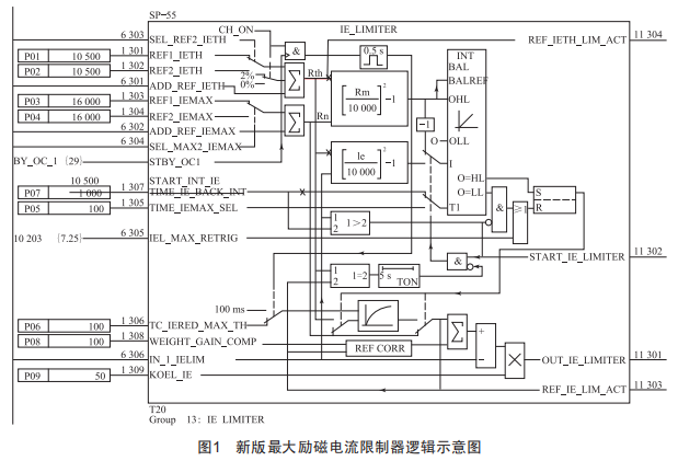 E0=IMACHE0$IVALEUT(參數(shù)1403):Ⅰ為實際定子電流標幺值(參數(shù)10210):將參數(shù)1406修改為定子電流限制器的啟動值:參數(shù)1401為勵磁電流限制器動作后的返回值:參數(shù)6401(最大連續(xù)定子電流附加參考值)基本設(shè)置為0。新版定子電流限制器邏輯示意圖如圖2所示。