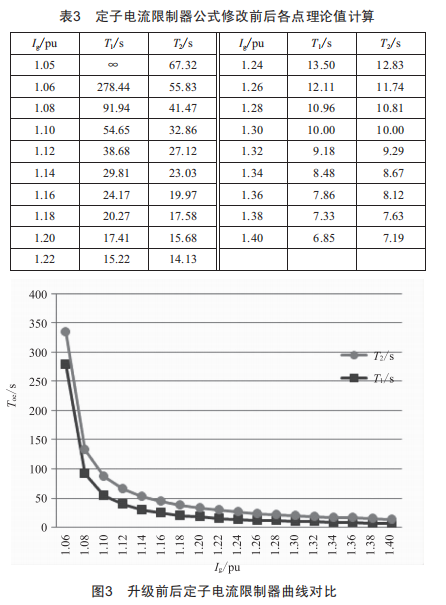 計算公式中不再包含限制器的啟動值。其中,1E0為最大等效定子電流(參數(shù)1403):1為實際定子電流(參數(shù)10210):7為等效定子電流的延時(參數(shù)1404)。按照標準要求,設(shè)置1403=200%,7=10s,代入上述公式得出:(1E02-1)×7=30s:可以與1EEE標準定義的定子過載能力公式(1E02-1)×7=37.5s相匹配。限制器公式修改前后各點理論值計算如表3所示。升級前后定子電流限制器曲線對比如圖3所示,跟0EL對應參數(shù)組類似的情況,定子過電流參數(shù)組參數(shù)1406的定義和數(shù)值發(fā)生了變化。