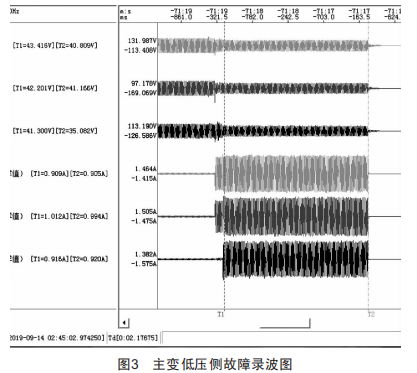 主變高后備保護動作分析:如圖2所示,B、C相電流值(最高值為0.36A)超過高壓側過流Ⅲ段定值的最大持續(xù)時間2068mS,大于定值時限2S,且高壓側未投入經復壓閉鎖控制字,因此只要高壓側電流大于0.35A且持續(xù)時間超過2S,高壓側過流Ⅲ段保護就會動作。