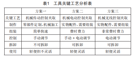 針對設定的研制目標提出了多種方案,主要為機械傳動控制夾取、機械電動控制夾取、機械無線控制夾取等,但鑒于目前市場沒有可以直接借鑒的產(chǎn)品,只能采用自行采購零部件組裝的方法,職創(chuàng)小組邀請了5位專家進行可行性分析和評估打分,綜合了各方案的優(yōu)缺點,確定了最終的方案為機械無線控制夾取,該方案具有安全可靠、拆裝方便、適用性強、便于推廣的優(yōu)點,但制作水平較高,難度不小。不同方案的工具關鍵工藝分析如表1所示。