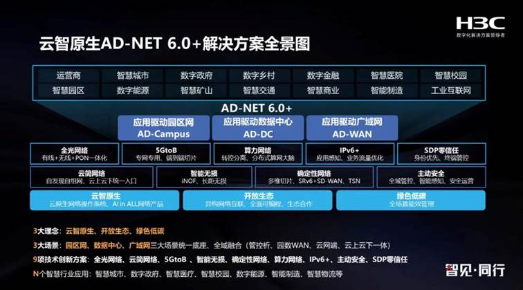 在新華三集團(tuán)看來,未來網(wǎng)絡(luò)需要向著智能化、確定性、超大規(guī)模、超大帶寬、安全可信、綠色低碳等方向加速演進(jìn),才能打造出能夠應(yīng)對(duì)未來創(chuàng)新需求的網(wǎng)絡(luò)平臺(tái)。為此,“云智原生、開放生態(tài)、綠色低碳”成為了新華三AD-NET 6.0+版本的三個(gè)關(guān)鍵詞: