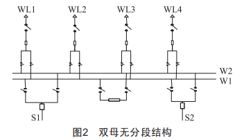 雙母結構包括雙母無分段、雙母3分段、雙母4分段、3/2接線、4/3接線、變壓器母線組接線及雙母(分段)加旁母接線等,其中雙母無分段結構如圖2所示。