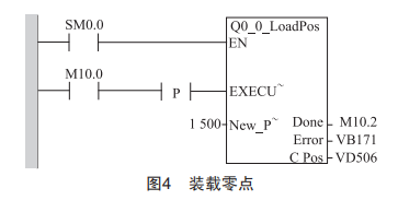 第三步,調(diào)用000LoadPos功能塊。由于第二步找到的參考點(diǎn)位置與實(shí)際控制要求的參考點(diǎn)有一定的偏差,在本控制系統(tǒng)中偏差值為+15mm,為了清晰地定義絕對(duì)位置,必須重新尋找參考點(diǎn),使得原參考點(diǎn)失效。本文中15mm對(duì)應(yīng)的脈沖數(shù)為1500個(gè),因此"NVwPos"設(shè)置為"1500",如圖4所示,用于將當(dāng)前位置的絕對(duì)位置設(shè)置為預(yù)置值。