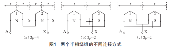 變極調(diào)速即改變?nèi)喈惒诫妱?dòng)機(jī)定子繞組的極對(duì)數(shù),是通過改變定子繞組的連接方式完成的。以單相繞組為例,若一相繞組由兩個(gè)半相繞組l和2組成。當(dāng)兩個(gè)半相繞組首尾依次連接,即兩個(gè)半相繞組正向串聯(lián),再通入電流,如圖l(a)所示。由右手定則判斷,將得到2p=4的磁場分布。如果將兩個(gè)半相繞組尾尾相接,即將其反向串聯(lián)再通入電流,如圖l(b)所示,將產(chǎn)生2p=2的磁場分布。如果將兩個(gè)半相繞組首尾兩兩連接,即兩個(gè)半相繞組反向并聯(lián)再通入電流,如圖l(c)所示,也產(chǎn)生2p=2的磁場分布。由此可知,改變定子繞組的接法,即可成倍改變定子極對(duì)數(shù),同步轉(zhuǎn)速也將成倍改變,故這種調(diào)速屬于有級(jí)調(diào)速。