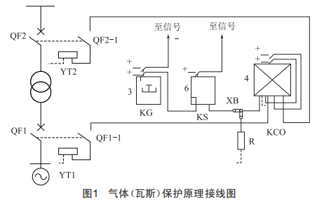 如圖1所示,瓦斯繼電器KG的上觸點(diǎn)為輕瓦斯保護(hù),接通后發(fā)信號(hào):下觸點(diǎn)為重瓦斯保護(hù),觸點(diǎn)閉合后經(jīng)信號(hào)繼電器Ks、連接片xB啟動(dòng)中間繼電器Kco:Kco動(dòng)作后兩對(duì)觸點(diǎn)閉合,分別經(jīng)斷路器oF1、oF2的輔助觸點(diǎn)接通各自的跳閘回路,跳開變壓器兩側(cè)的斷路器。