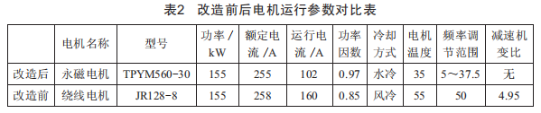 改造前后電機運行參數(shù)對比如表2所示。改造后去掉了原來的傳動齒箱,電機風(fēng)冷改為水冷,功率因數(shù)提升,運行電流降低。