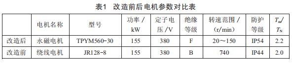 改造前后電機參數(shù)對比如表1所示。改造后絕緣等級由B級提升至F級,防護等級提升,電機的過載能力提高。