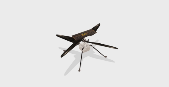 這架直升機(jī)采用反向旋轉(zhuǎn)的同軸旋翼,直徑約1.2米(4英尺),頂部裝有用于充電的太陽(yáng)能電池板。底部裝有一個(gè)高分辨率攝像機(jī),方向朝下,用于幫助探測(cè)器導(dǎo)航、著陸和科學(xué)測(cè)量地形。