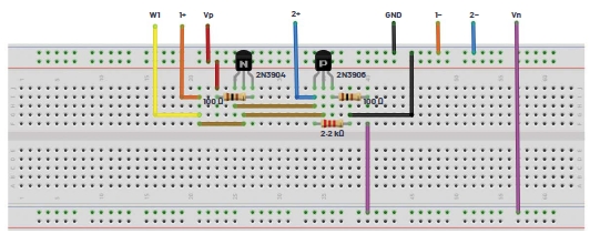 開始之前,請確保關(guān)閉ADALM2000上的電源。電路和實(shí)驗(yàn)室硬件的連接如圖1所示。示波器輸入1應(yīng)連接到Q1和Q2基極的接合處。示波器輸入2應(yīng)連接到Q1和Q2發(fā)射極的接合處。