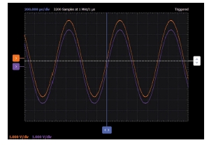 波形發(fā)生器W1配置為1 kHz正弦波,峰峰值幅度約為6.0 V,偏移為0。使用示波器通道1觀察W1的輸入,使用示波器通道2觀察放大器在RL處的輸出。
