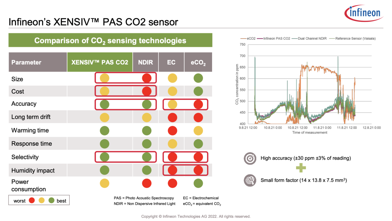 憑借著MEMS的豐富技術(shù)積累,英飛凌創(chuàng)新地提供了一種基于“光聲光譜技術(shù)”的CO2傳感器——XENSIVTM PAS CO2,提供正負(fù)30PPM和正負(fù)3%的精度。傳統(tǒng)CO2感知技術(shù)有NDIR、EC和eCO2技術(shù),其中EC和eCO2的精度和選擇性都不如NDIR,而且容易受到濕度的影響。光聲光譜的CO2傳感器可以提供與NDIR相同的精度和選擇性,同時(shí)因?yàn)椴捎肕EMS技術(shù),所以在尺寸上和成本上具有優(yōu)勢(shì),可以減少客戶整體的設(shè)計(jì)復(fù)雜度。如下圖所示,光聲光譜的二氧化碳傳感器,雙通道的NDIR傳感器和參考用的傳感器對(duì)比,它們的測(cè)量曲線是非常接近的,但是eCO2的偏差就非常大。