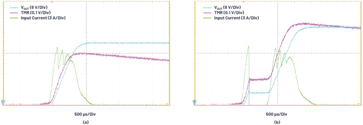 圖2.LTC4381 10 A保險(xiǎn)絲電路采用(a) 48 V(左)和(b) 60 V(右)電源啟動(dòng)220 μF負(fù)載電容