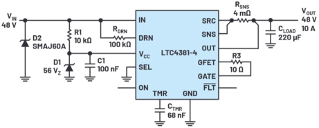 48 V、10 A電子保險(xiǎn)絲電路