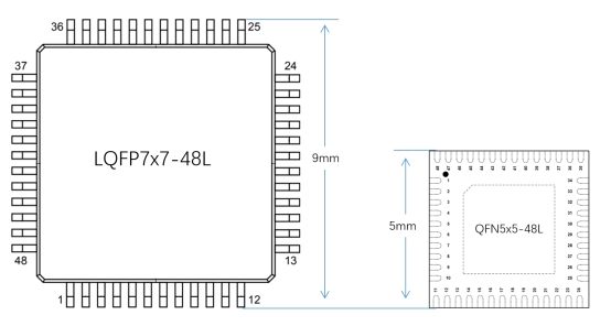小 WS49T31xQ系列采用QFN5x5-48L封裝,相對(duì)于傳統(tǒng)LQFP7x7-48L封裝,尺寸縮小近70%。小型化封裝大幅降低了PCB的占用,對(duì)可穿戴或便攜式設(shè)備的ID設(shè)計(jì)十分友好。