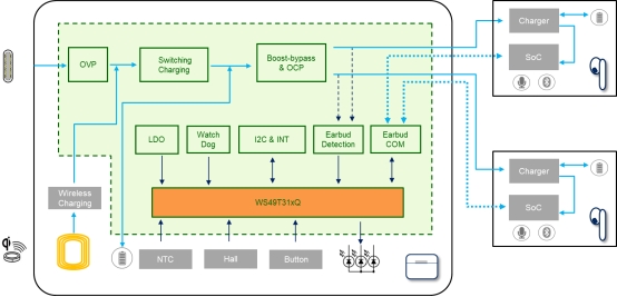省 WS49T31xQ系列對(duì)功耗進(jìn)行了優(yōu)化設(shè)計(jì), Standby mode功耗控制在1.5μA以下,低功耗特性大幅延長(zhǎng)整機(jī)的續(xù)航時(shí)間,非常適合電池供電設(shè)備的應(yīng)用。另外,數(shù)字,模擬,Core獨(dú)立供電設(shè)計(jì),數(shù)字接口可通過(guò)VDDIO自由選擇1.8V~3.3V邏輯電平,極大的方便了外設(shè)的連接。我們?nèi)砸訲WS耳機(jī)盒應(yīng)用為例,與耳機(jī)通訊的UART接口設(shè)定為1.8V電平,ADC可以工作在3.3V,這樣既可直接適配耳機(jī)端通信,又能夠保證ADC采集的精度和量程,節(jié)省了電平轉(zhuǎn)換的成本。最后,獨(dú)立PWM模塊可直接驅(qū)動(dòng)2顆RGB LED,進(jìn)一步節(jié)省了外圍元器件。