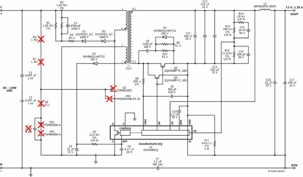 這款簡(jiǎn)單的反激式變換器設(shè)計(jì)集成了碳化硅開(kāi)關(guān)以及初級(jí)和次級(jí)控制器。InnoSwitch3-AQ IC使用FluxLink?進(jìn)行隔離,可讓次級(jí)控制器成為主控制器。這種不尋常的架構(gòu)意味著次級(jí)側(cè)決定何時(shí)進(jìn)行初級(jí)開(kāi)關(guān)操作,實(shí)現(xiàn)同步整流而沒(méi)有通常的缺點(diǎn)(例如,開(kāi)關(guān)時(shí)間不正確),并能對(duì)所有故障做出響應(yīng)。