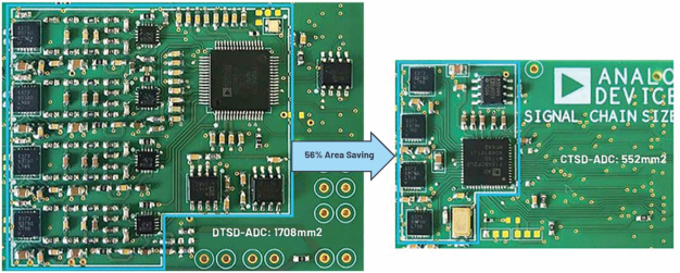 圖2.DTSD和CTSD的尺寸對(duì)比,顯示使用CTSD ADC可以明顯減小尺寸