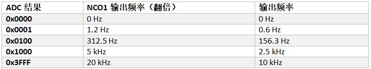 在該示例中,已將NCO2設置為在內部創(chuàng)建所需的輸入時鐘頻率,以通過14位輸入獲得100 kHz輸出。之所以使用14位結果,是因為ADCC本身的12位結果不足以在沒有外部時鐘源的情況下產生100 kHz輸出。