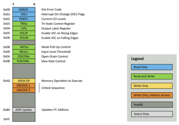 在器件內部,高級I/O擴展器在基于查找表的結構上運行。在讀取或寫入之前,會發(fā)送一個虛擬地址。該地址與單片機上的寄存器無關——僅特定于查找表。這意味著,可以透明地添加不在單片機硬件寄存器中的功能。此外,還可以針對特定用途,輕松地重新排列表格中的條目。這種結構的另一個優(yōu)勢是,能夠向查找表添加權限。例如,要創(chuàng)建一個只讀寄存器,只需省略查找表的寫條目即可。