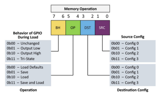 這種較為復雜的結構也適用于非標準功能?!癕EM OP”功能允許MCU將其當前的通用輸入和輸出(GPIO)配置保存或加載到存儲器中。