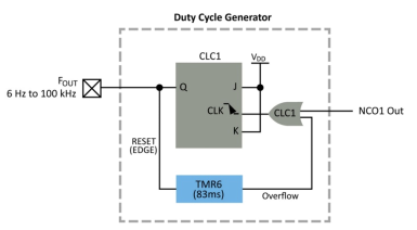 該生成器使用一個可配置邏輯單元(CLC)實現(xiàn)。CLC是可配置邏輯的小型模塊,類似于現(xiàn)場可編程門陣列(FPGA)的一個單元。CLC可用作離散邏輯門(例如AND-OR或OR-XOR),也可以配置為鎖存器或觸發(fā)器。在該解決方案中,CLC實現(xiàn)為帶復位功能的J-K觸發(fā)器。J和K保持在邏輯高電平。輸出振蕩器模塊用作觸發(fā)器的時鐘。每個輸入時鐘脈沖均會導致輸出翻轉,從而產生50%的占空比。注意:輸出振蕩器模塊的頻率抖動將對占空比產生影響。