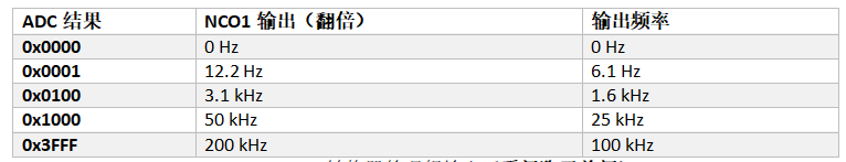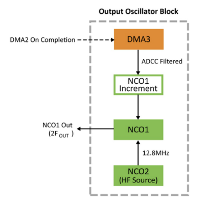 輸出振蕩器模塊的核心是數(shù)控振蕩器(NCO)。NCO外設的工作原理是在輸入時鐘的上升沿向累加器添加增量值,然后根據(jù)累加器溢出導出外設的輸出。(有關NCO的完整說明,請參見數(shù)據(jù)手冊。)
