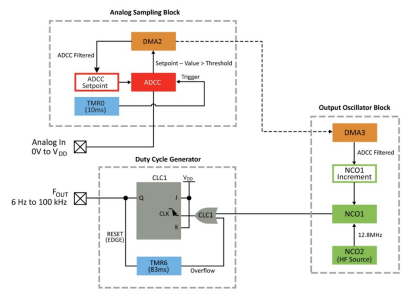 MCU不使用模擬技術進行數(shù)字化,而是使用獨立于內核的外設和功能的組合。MCU使用內部帶計算功能的模數(shù)轉換器(ADCC)測量輸入信號,然后對時鐘信號進行分頻,以創(chuàng)建可變頻率輸出。在該示例中,外設已設置為在初始化后獨立于CPU運行。這意味著,CPU可以用于最終應用中的其他任務。