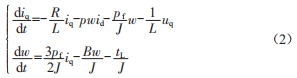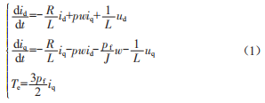 式中,id、iq、ud、uq為d、g軸上的定子電流與電壓:W為機(jī)械角速度:R為定子電阻:1為永磁磁鏈:J為調(diào)速系統(tǒng)等效轉(zhuǎn)動慣量。