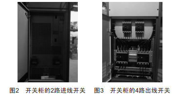 成套開關(guān)柜由2路0.4kV進(jìn)線斷路器(250A)、4臺(tái)負(fù)載出線開關(guān)、1臺(tái)零中斷控制和逆變器等組成。開關(guān)柜的2路進(jìn)線開關(guān)如圖2所示,開關(guān)柜的4路出線開關(guān)如圖3所示。