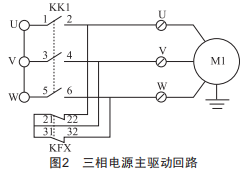 該電梯在本次定期檢驗時運行正常,只在松閘試驗出現(xiàn)了快速沖頂現(xiàn)象,且在正常情況下,電梯松閘后都是以緩慢速度溜車。為了找出此次沖頂?shù)脑?我們又仔細查閱了此臺電梯的維護保養(yǎng)記錄及電氣原理圖,如圖2所示,發(fā)現(xiàn)維修保養(yǎng)記錄了近期因接觸器損壞而更換了新的接觸器,我們對其檢查時發(fā)現(xiàn),原電氣原理圖中所要求的封星接觸器KFx被更換為普通的接觸器。其中,圖2中KK1為運行接觸器,KFx為封星接觸器,M1為電動機,U、V、w為三相電源。