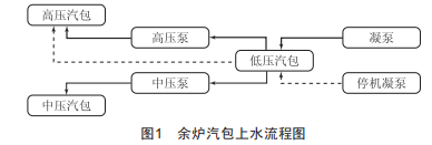 按照相關(guān)規(guī)程,余熱鍋爐在冷態(tài)補(bǔ)水時(shí)的大概流程為:先就地將高、中、低給水系統(tǒng)相關(guān)放水門(mén)關(guān)閉,同時(shí)打開(kāi)相對(duì)應(yīng)的放空氣門(mén),在放空氣門(mén)連續(xù)見(jiàn)水后關(guān)閉放空氣門(mén)。然后在集控室依次啟動(dòng)凝泵、中壓泵、高壓泵,為對(duì)應(yīng)的給水系統(tǒng)上水,如圖1粗線條所示,這一流程以凝泵為核心。凝泵額定功率為500kw,高壓給水泵額定功率為2200kw。在多次上水過(guò)程中發(fā)現(xiàn),此過(guò)程雖然時(shí)間短,但是耗能相對(duì)較大。