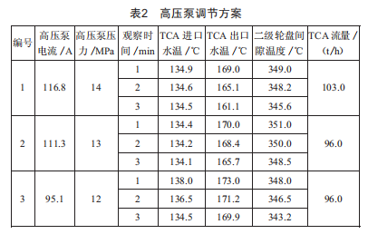 機(jī)組停運(yùn)后,由于系統(tǒng)內(nèi)仍存在部分余熱,所以按照三菱要求在盤(pán)車(chē)投運(yùn)后仍需保證高壓泵運(yùn)行0.5h。為了完成節(jié)能降耗目標(biāo),機(jī)組停運(yùn)后,即降低高壓泵出力至一定值,經(jīng)過(guò)多次停機(jī)取值發(fā)現(xiàn),在不影響TCA系統(tǒng)冷卻效果、TCA水側(cè)出口不引起閃蒸及電氣允許的情況下,可以將高壓泵電流最低降到56.2A,維持高壓泵出口壓力在9MPa,具體方案如表2所示。