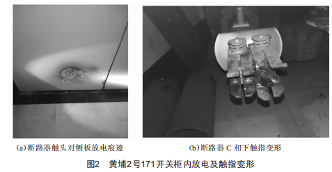 如圖1所示,保護(hù)啟動(dòng)后,三相電流迅速增大,三相電壓迅速降為零,零序電壓為零,因此可判斷故障類(lèi)型為A、B、C三相短路。進(jìn)一步分析得知,本次事故中保護(hù)裝置動(dòng)作電流為8184A/20.46A,遠(yuǎn)大于裝置整定值6.5A,主變低后備保護(hù)動(dòng)作,延時(shí)1.2s后跳開(kāi)102開(kāi)關(guān),保護(hù)動(dòng)作成功。后現(xiàn)場(chǎng)檢查發(fā)現(xiàn),10kV黃埔2號(hào)171開(kāi)關(guān)柜內(nèi)開(kāi)關(guān)觸頭盒和開(kāi)關(guān)本體B相動(dòng)觸頭絕緣護(hù)套燒毀,分析判斷柜內(nèi)因設(shè)備燒毀發(fā)生了三相弧光短路,導(dǎo)致2號(hào)主變低后備保護(hù)動(dòng)作,與保護(hù)動(dòng)作情況相符合。