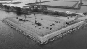塔位基礎(chǔ)采用灌注樁基礎(chǔ),灌注樁施工期間產(chǎn)生的污染物主要是施工過(guò)程中產(chǎn)生的鉆渣、懸浮泥沙(泥漿)、施工機(jī)械的油污。施工過(guò)程中為避免產(chǎn)生的懸浮物及溢油等污染物對(duì)水質(zhì)及海洋生物造成影響,施工前通常在塔基海域搭建臨時(shí)施工平臺(tái)。臨時(shí)施工平臺(tái)采用1:6的水泥砂加適量水機(jī)械攪拌后裝入尼龍袋壘砌,并填砂沖水密實(shí),臨時(shí)施工平臺(tái)斷面如圖1所示。臨時(shí)施工平臺(tái)現(xiàn)場(chǎng)圖如圖2所示。