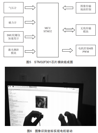 采用sTM32F301單片機(jī)作為四軸飛行器控制系統(tǒng)核心,通過調(diào)制PwM信號控制無刷電機(jī)的轉(zhuǎn)動(dòng)。在四軸飛行器的飛行控制原理學(xué)習(xí)過程中,通過學(xué)習(xí)算法、編程、調(diào)試,實(shí)現(xiàn)四軸飛行器的懸停。為了提高圖像獲取和處理的速度,采用sTM32F301開發(fā)板,通過將飛行控制核心板和串口通信進(jìn)行連接,飛控板上所需要的控制量由圖像處理所獲得,從而實(shí)現(xiàn)巡線功能。在不斷的調(diào)試和改進(jìn)中,飛行器實(shí)現(xiàn)定點(diǎn)懸停和巡線功能。本系統(tǒng)主要由sTM32F301飛行控制模塊和sTM32F301無線傳輸模塊、電機(jī)控制4路PwM、激光測距模塊組成,如圖5所示。