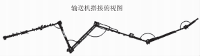 搭接一般是物料經(jīng)輸送機(jī)機(jī)頭漏斗、溜槽卸料至下一條輸送機(jī)的落料點(diǎn)處,或是卸料至破碎機(jī)、振動(dòng)篩、混煤機(jī)中經(jīng)處理后再卸料至下一個(gè)落料點(diǎn)。設(shè)計(jì)高度首先要保證各類(lèi)設(shè)備能準(zhǔn)確無(wú)誤地安裝上去,其次留有空間安裝破碎機(jī)、振動(dòng)篩、混煤機(jī)下面的溜槽。如高度不夠,料流軌跡不合理,不僅造成噪聲污染、粉塵污染,同時(shí)加速溜槽的磨損,膠帶、緩沖托銀、緩沖床、破碎機(jī)、振動(dòng)篩、混煤機(jī)等設(shè)備也極易損壞。輸送機(jī)搭接俯視圖如圖2所示。