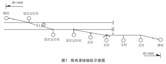 上行、下行間渡線采用站場站線錨段替代時,站線錨段通常需經(jīng)過兩組道岔,分別為:站線與正線間相連接道岔,上、下行正線間相連接道岔。在兩組道岔定位間,站線錨段接觸線抬高,為非工作支。既有渡線錨段示意圖如圖1所示。