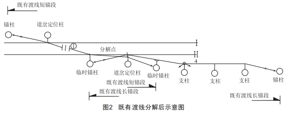利用"V型天窗"先進(jìn)行既有錨段分解(分解點選擇在既有渡線錨段兩組道岔定位間且該處渡線錨段接觸線抬高并為非工作支,分解點周邊跨距內(nèi)選擇兩個錨柱作為臨時錨柱進(jìn)行下錨,分解后渡線短錨段需延長一跨下錨,便于分解后既有分段絕緣器調(diào)整),將既有渡線錨段分解為獨立的長錨段和短錨段,分解后延長區(qū)段利用區(qū)間拆除后既有承力索,錨段分解后接觸網(wǎng)參數(shù)不發(fā)生變化。