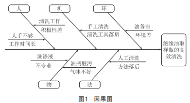 為找出實現(xiàn)絕緣油取樣瓶高效清洗的問題癥結(jié)所在,課題小組利用頭腦風(fēng)暴法,從人員、機(jī)器、材料、方法和環(huán)境五個角度進(jìn)行了分析,整理得出因果圖,如圖1所示。