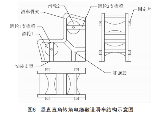 豎直直角轉(zhuǎn)角電纜敷設(shè)滑車結(jié)構(gòu)如圖6所示,它由滑車骨架、兩個承載滑輪、滑輪支撐梁、滑車安裝支架、滑車安裝固定片、加強筋等部分組成。