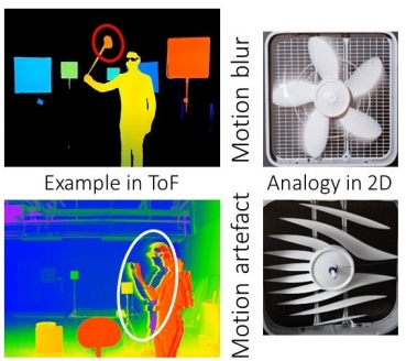 在上述例子中,需要三個圖像(兩個相位+背景)。如果使用單內(nèi)存節(jié)點(diǎn)像素傳感器(目前最常見),則需要循序地曝光和讀出多個相位。拍攝一次光得到相位0,另一次得到相位1,然后運(yùn)行第三次沒有光的采集并讀出以獲得背景信號。然后計算3D圖像。因此,如果有一個移動的物體,運(yùn)動偽影將出現(xiàn),因為每個相位物體將位于不同的位置。此外,光脈沖序列需要發(fā)送并拍攝兩次,即每個相位一次。