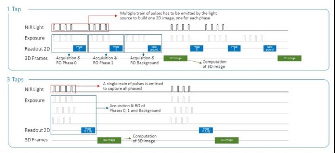 使用多內(nèi)存節(jié)點(diǎn)像素傳感器,例如上述三內(nèi)存結(jié)點(diǎn)像素,所有曝光和讀出都以交錯的方式進(jìn)行,因此所有相位幾乎都是并行獲得的,可以最大程度地減少運(yùn)動偽影。此外,由于相位可以用單個光脈沖序列捕獲,因而降低了平均光照功率,這從眼睛安全和功耗的角度來看都很重要。